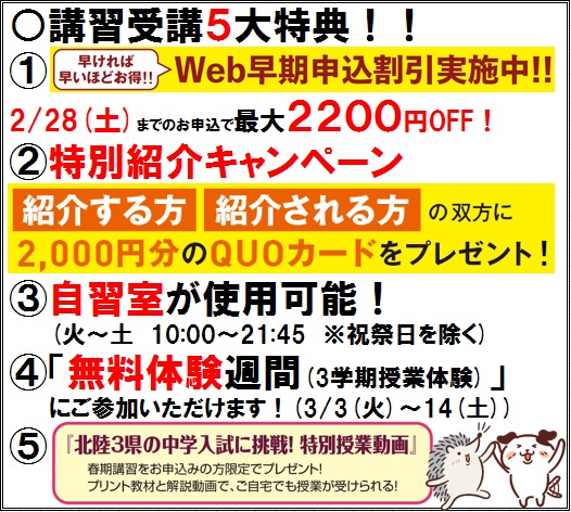 教師や保護者が「勉強しなさい」と言っても,なかなか子供たちの心には響かないものです。一番,子供たちの勉強へのエンジンがかかるのは,「周りの友達が努力しはじめた」時です。中学受験は富山県ではまだまだ少数派であり,小学校全体が受験ムードになる事はありません。子供たちを,受験生が多い環境下においてあげることで,自覚が生まれていくのです。その意味では,富山本部校が最良の環境であると自負しています♪
