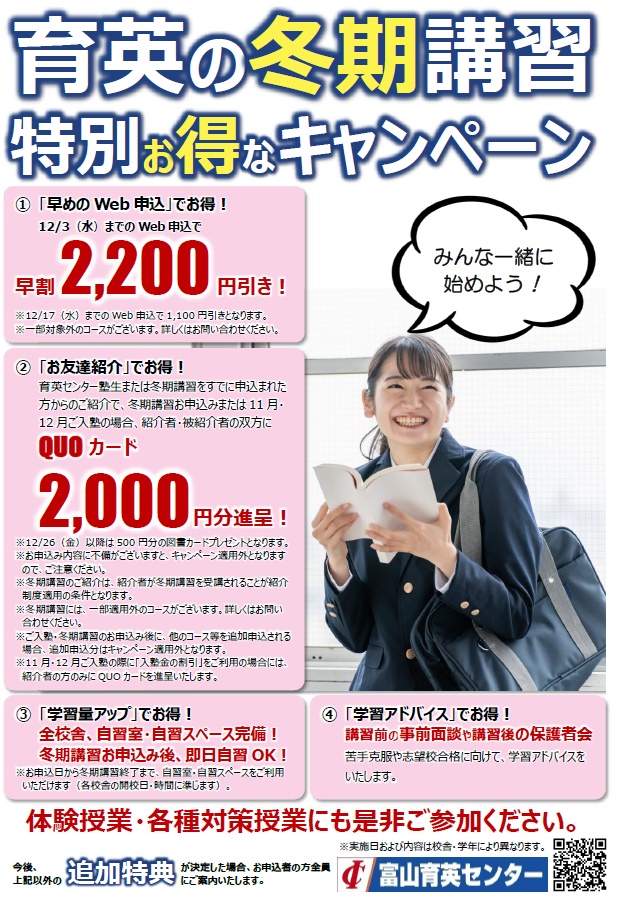②12/25(木)までに塾生・講習生からの紹介で,紹介する方・紹介される方 双方に2,000円のQUOカードをプレゼント!