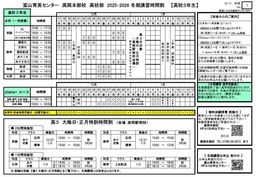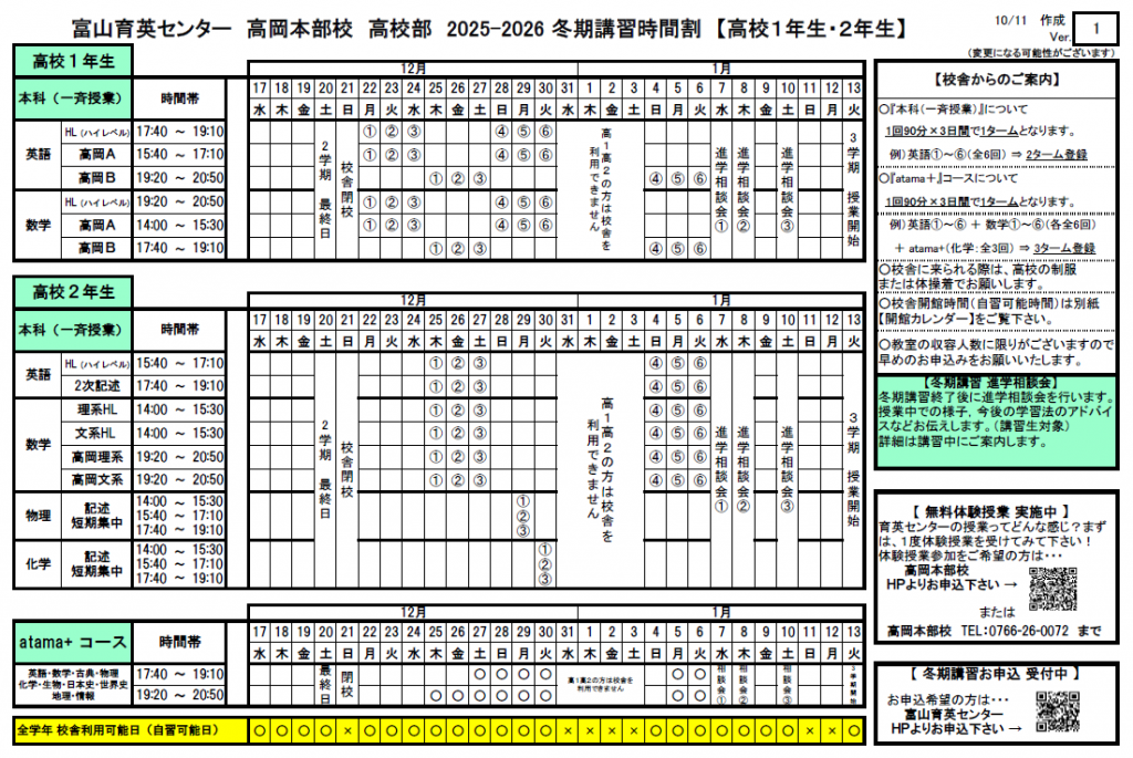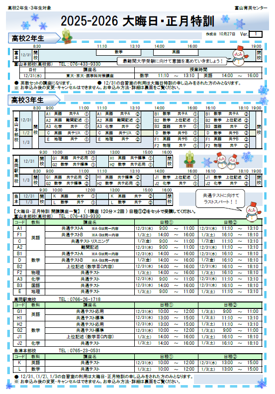 【高岡本部校 冬期講習時間割】