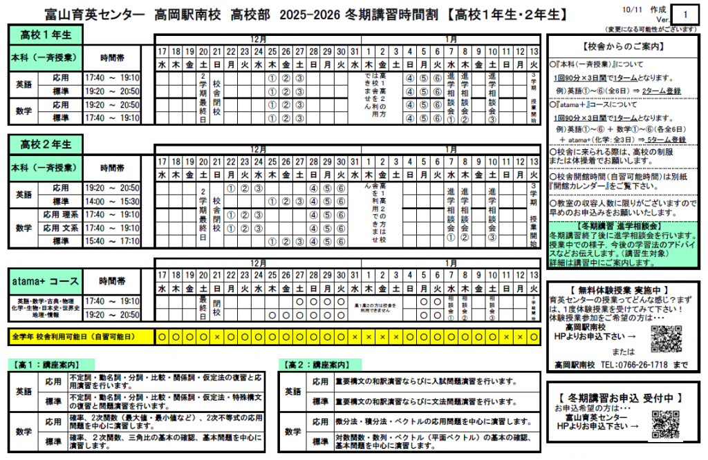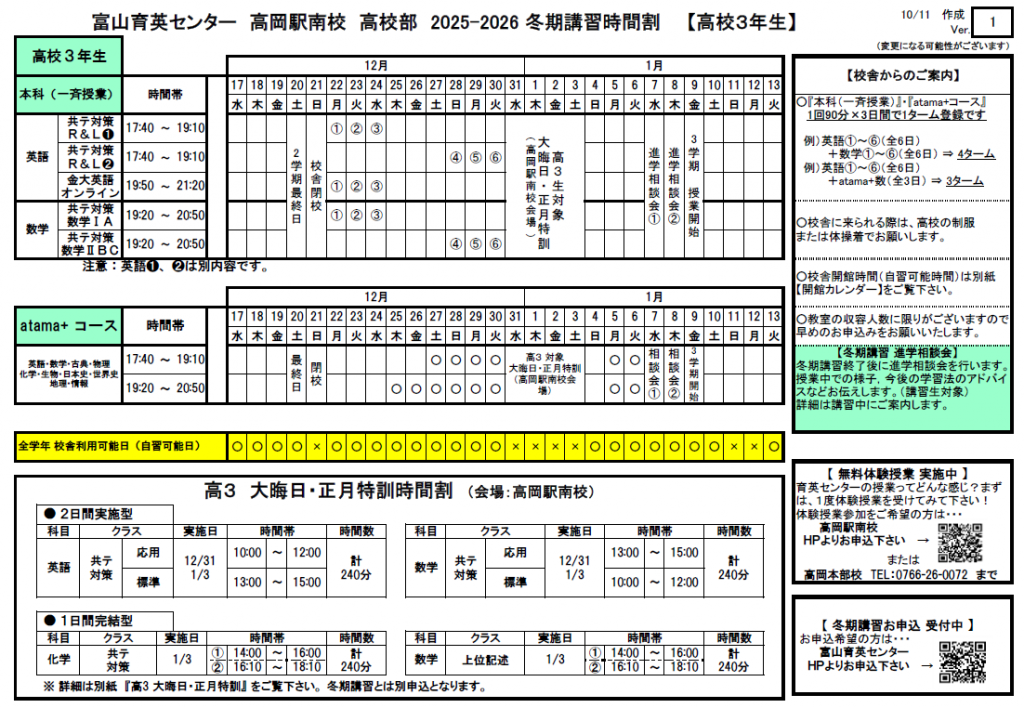 ③冬期講習申込日から冬期講習終了時点まで自習室利用可能!