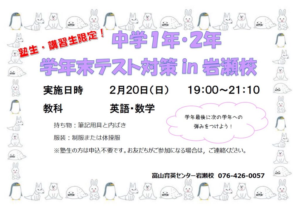 【岩瀬校】学年末テスト対策授業を実施いたします