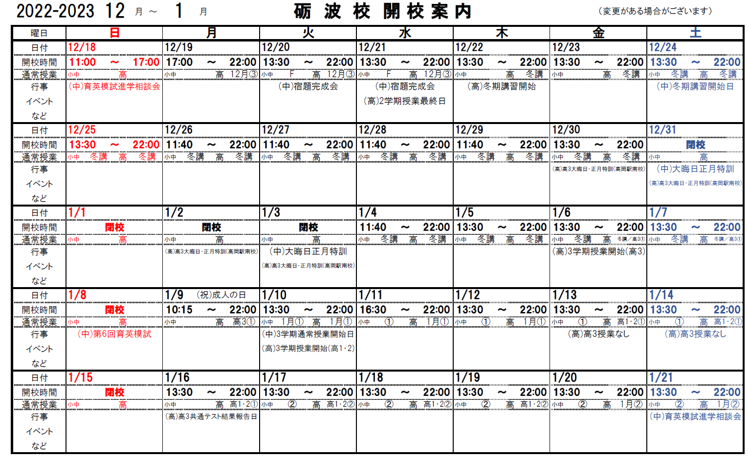 12/31(土)~1/3(火)の期間は、校舎休校となります。