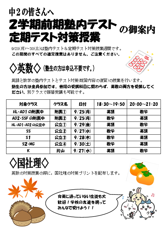 来週から『塾内テスト 兼 定期テスト対策授業週』となりますので、塾生さんには案内を配布しました。