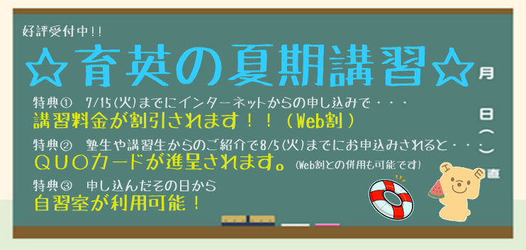 育英センターでは、夏休み期間に実施する夏期講習の受付を、6月より開始しました!