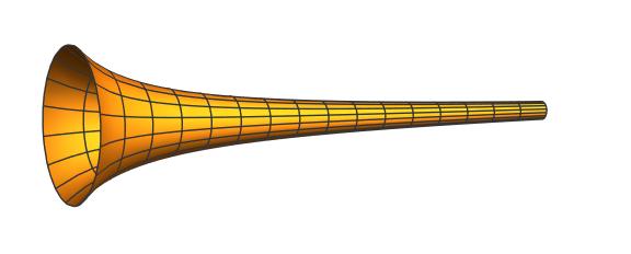 y=1/x の x≧1 の部分を x 軸の周りに回転してできる曲面を「ガブリエルのラッパ」といいます。
