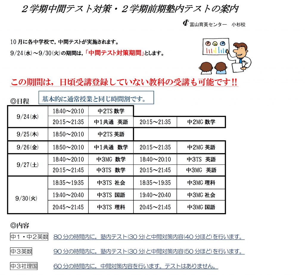 小杉校では,9/24(水)~9/30(火)の期間は,「中間テスト対策期間」として,テスト対策を中心に行います。