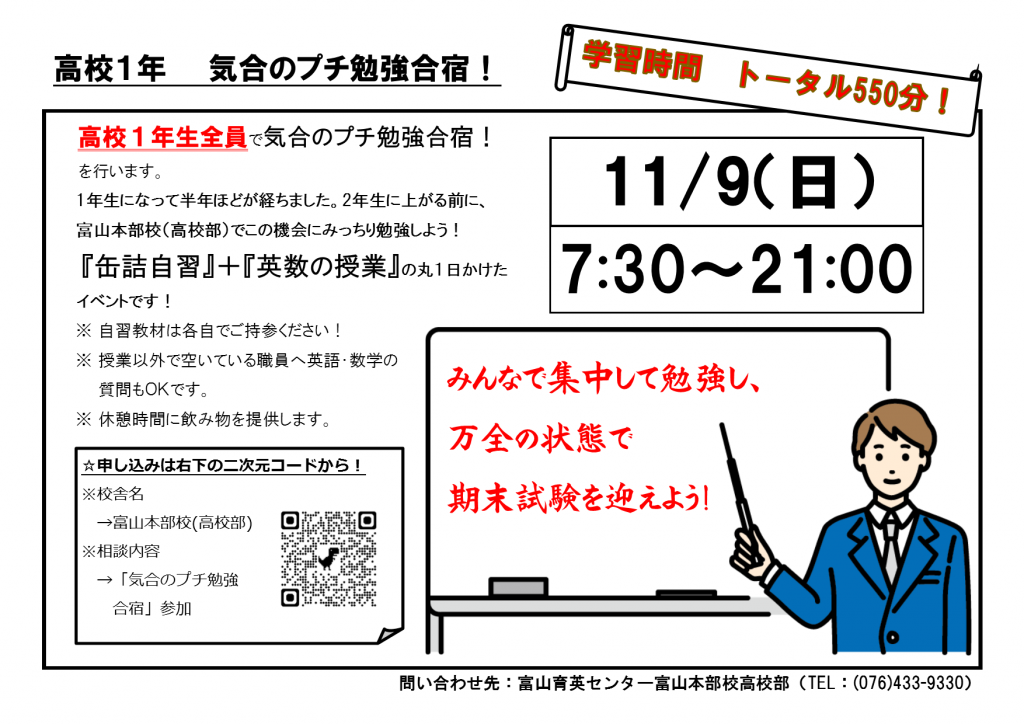 【高校1年生対象】11/9(日) プチ勉強合宿