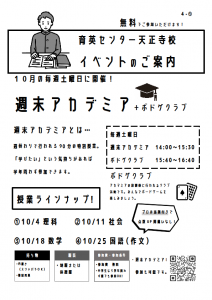 ➀10/4理科 ➁10/11社会 ➂10/18数学 ④10/25国語(作文)