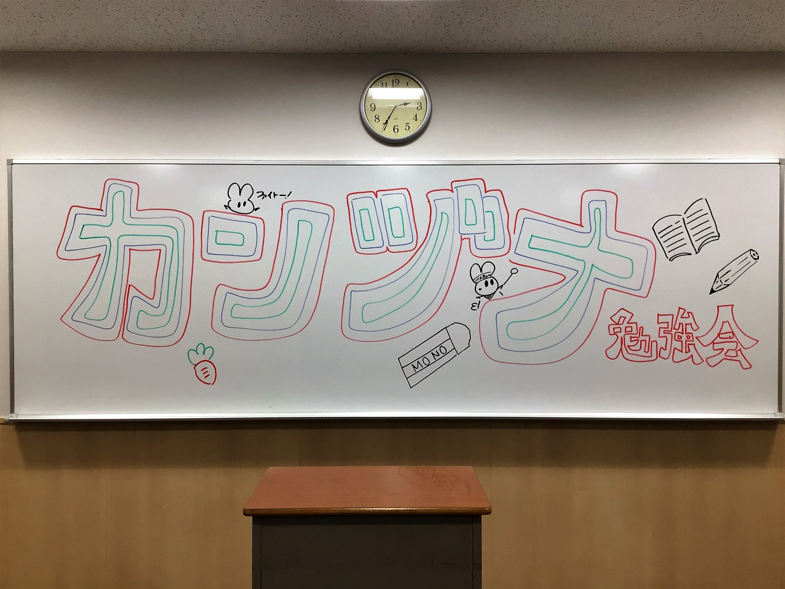 ホワイトボードに書いた「カンヅメ」の「メ」の字がヘタくそで「カンヅナ」のようになっていますね。。