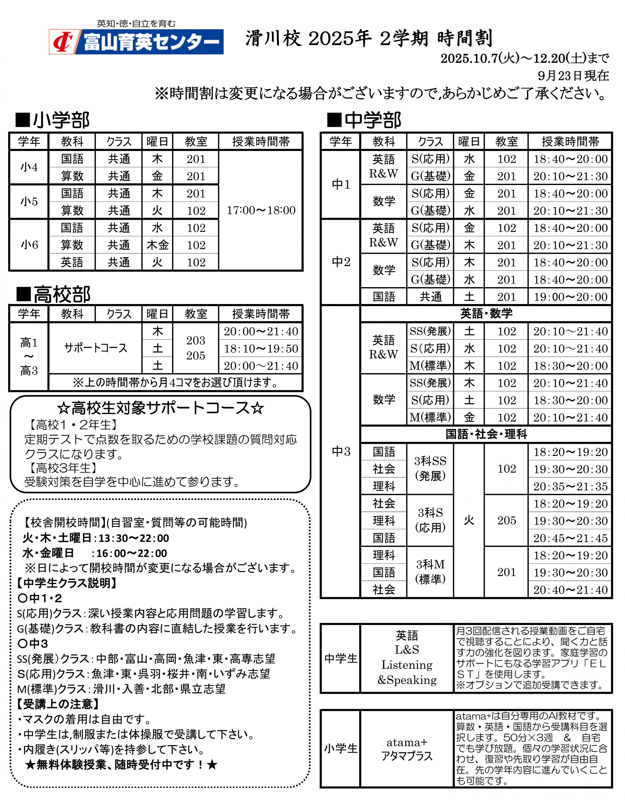 ※クラスについてのご相談はお気軽に滑川校(076-475-9222)までお問合せください。