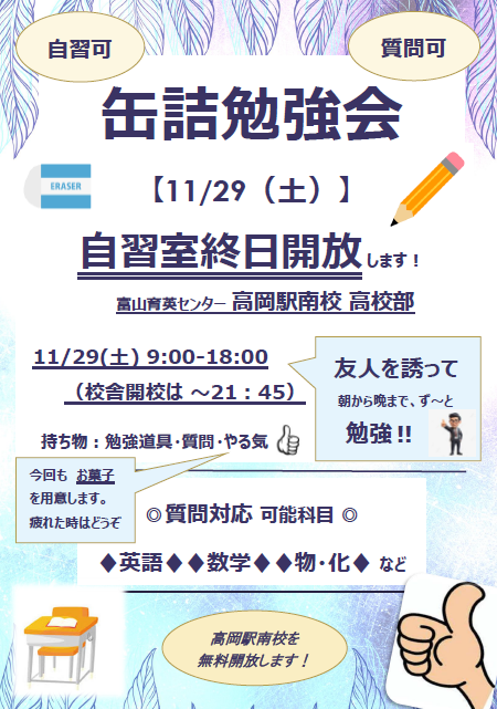 高岡駅南校では2学期期末テストに向け、11/29(土)に『缶詰勉強会』を開催します。