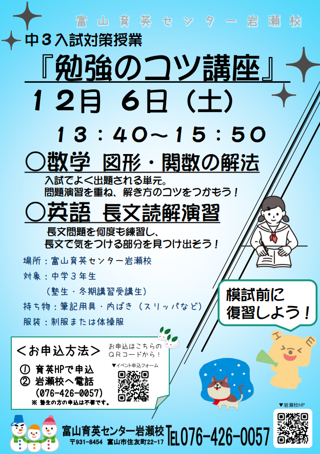 富山育英センターの冬休みの冬期講習、web超早割の〆切があと7日となりました!冬期講習は現学年2学期までの内容を徹底的に復習します。
