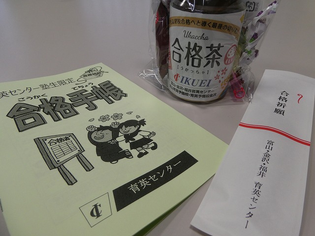 神社で合格祈願の御祈祷を受けた「合格茶(うかっちゃ)」などとともに、高岡本部校オリジナルの合格祈願グッズをお渡ししました。