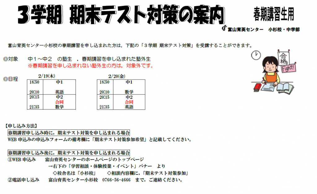 育英センター小杉校では,2/19(木),2/20(金)に「期末テスト対策授業」を実施します‼(対象:現中1生,現中2生)