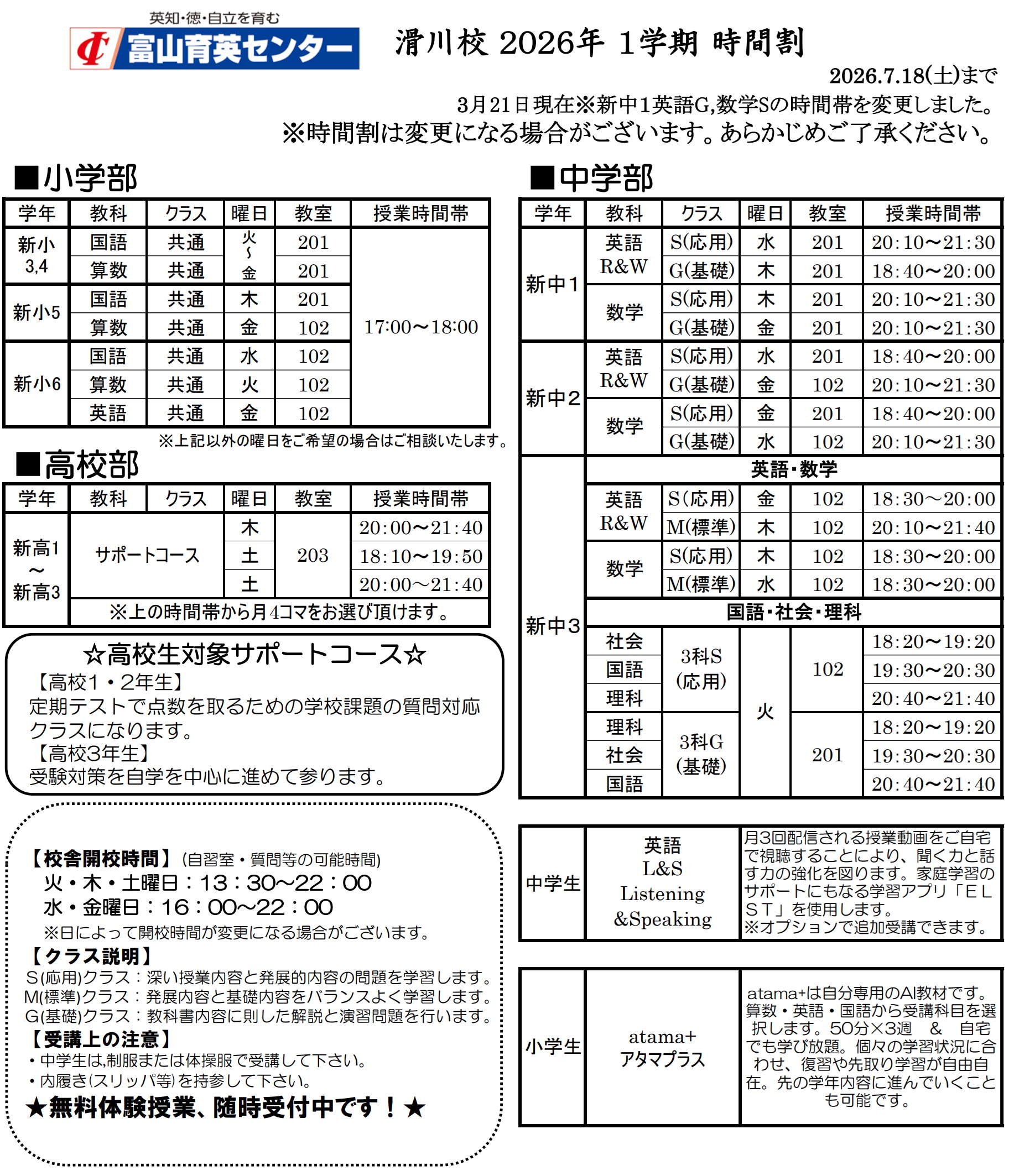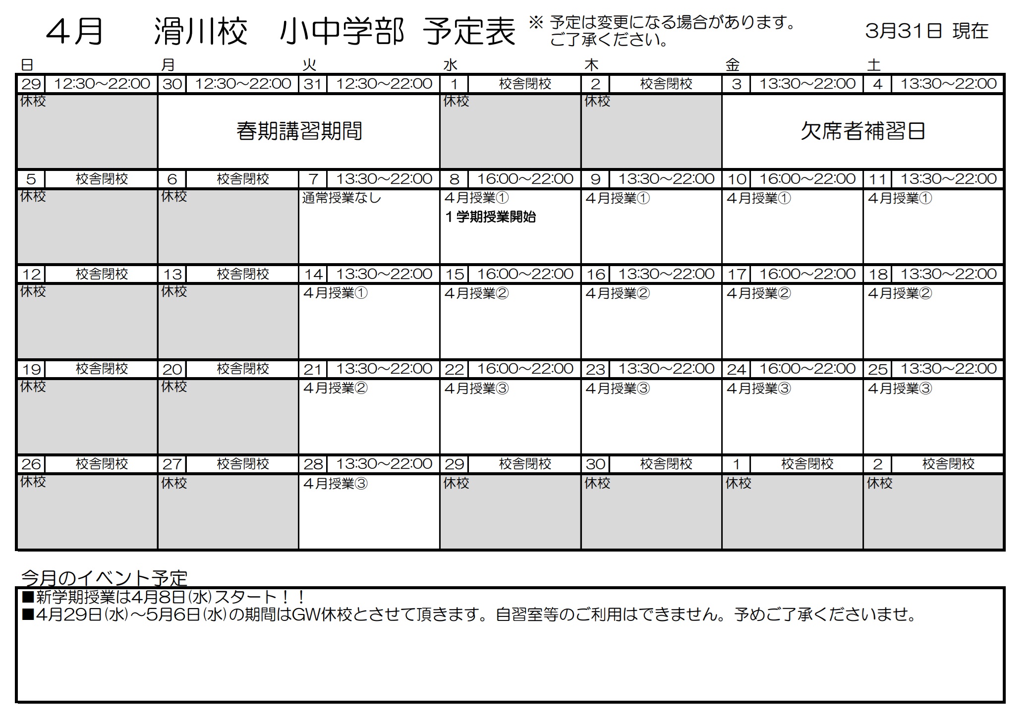 【滑川校】1学期通通常授業は4月8日(水)START!!