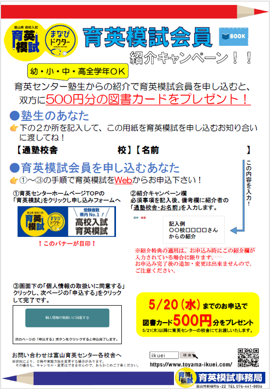 模試会員を申し込む際にお友達の名前を書いていただければ、500円分の図書カードをプレゼント!!