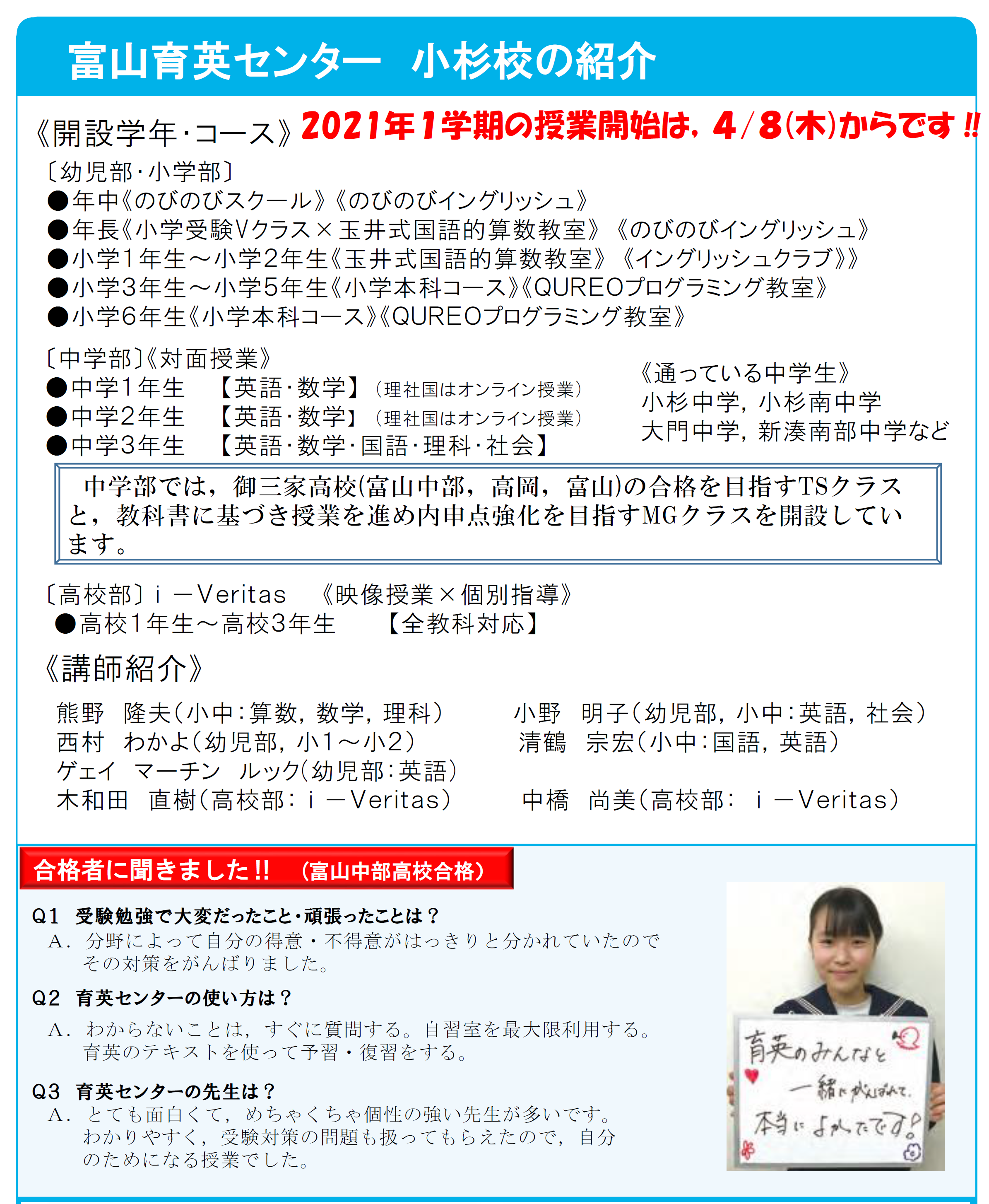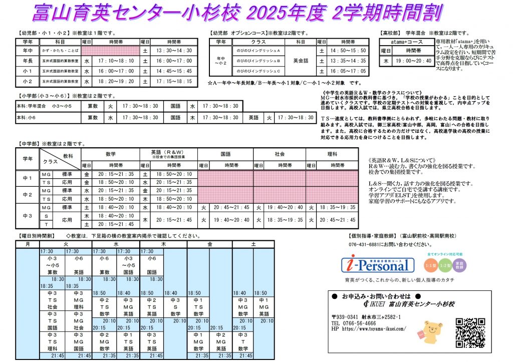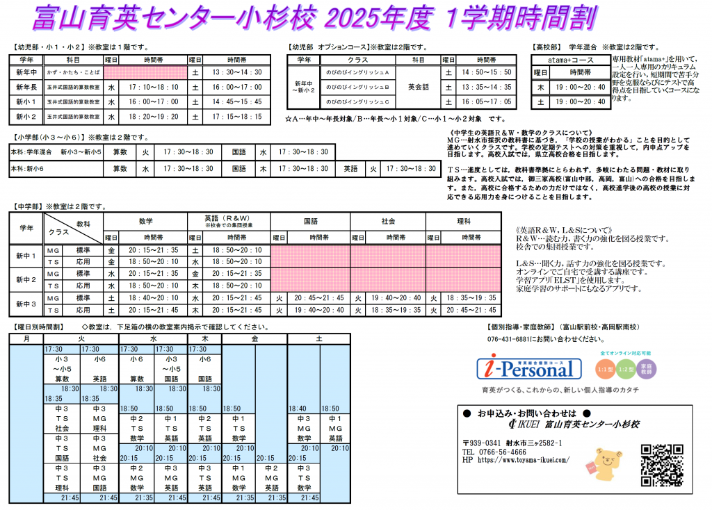 あいの風富山鉄道の小杉駅南口から徒歩3分と交通アクセスも良好で、幼児から高校生まで、幅広い学年の生徒が通っています
