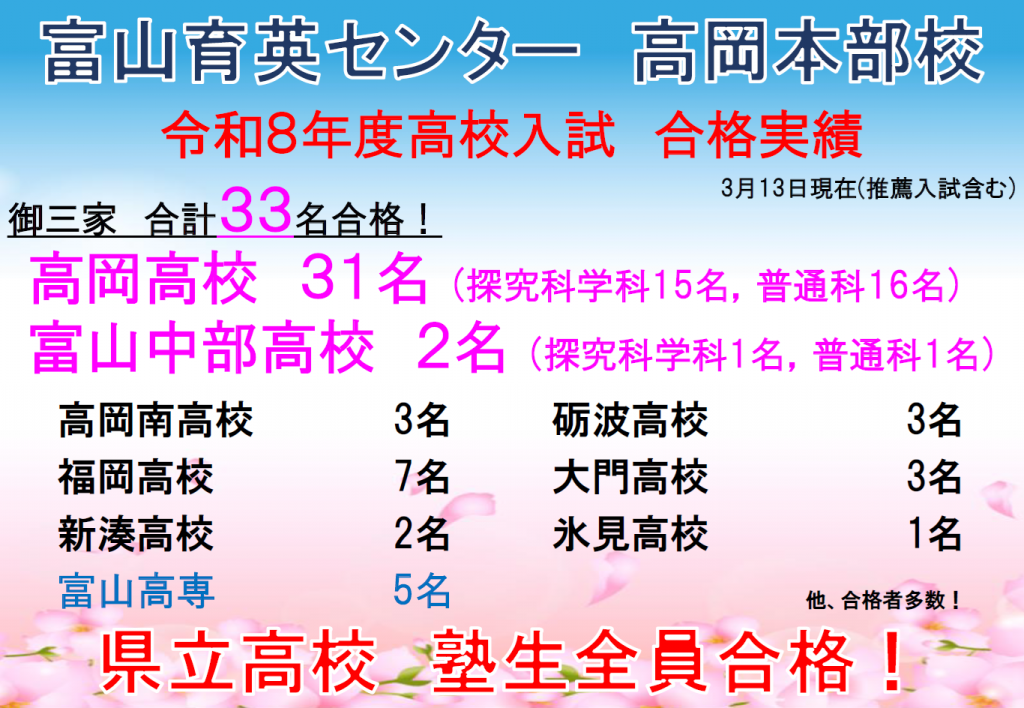 ※合格者には富山育英センター塾生のみ含まれ、講習生や模試生を含みません。また,高岡本部校・高岡駅南校・新湊校全体の合格実績です。