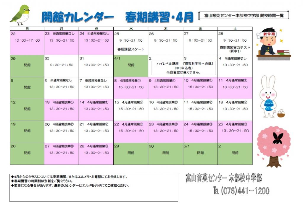 印刷用はこちら⇒2026 4月開館カレンダー【本部校中学部】