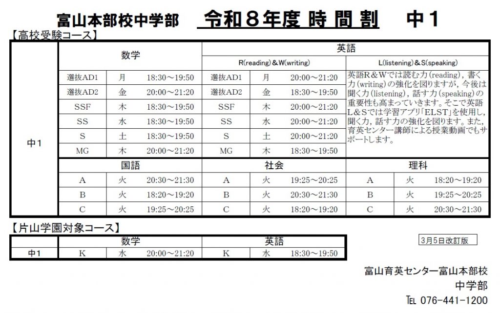 印刷用はこちら⇒2026時間割1学期富山本部校中学部_中1