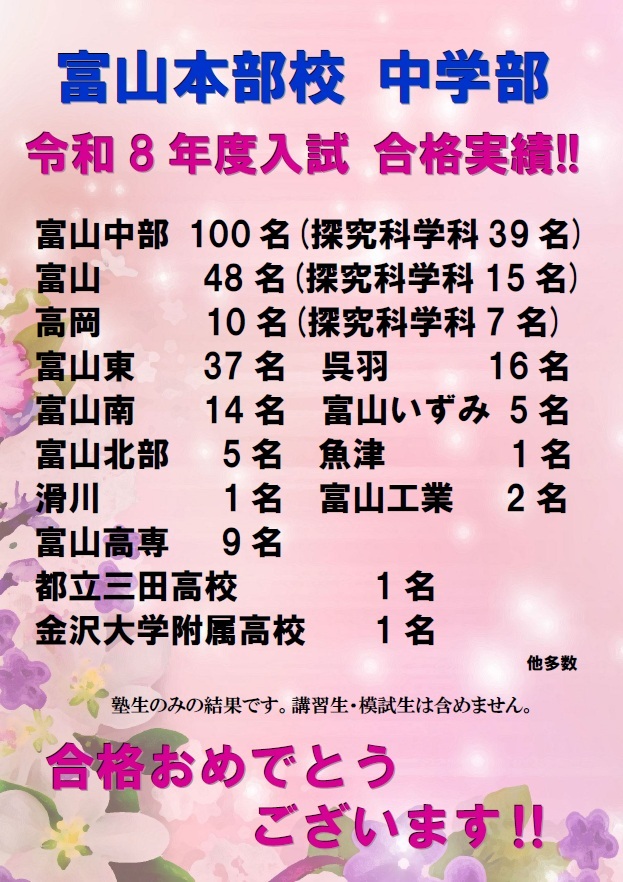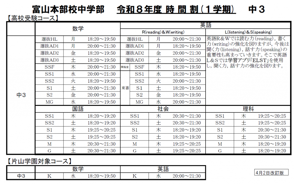 印刷用はこちら⇒2026時間割1学期富山本部校中学部_中3