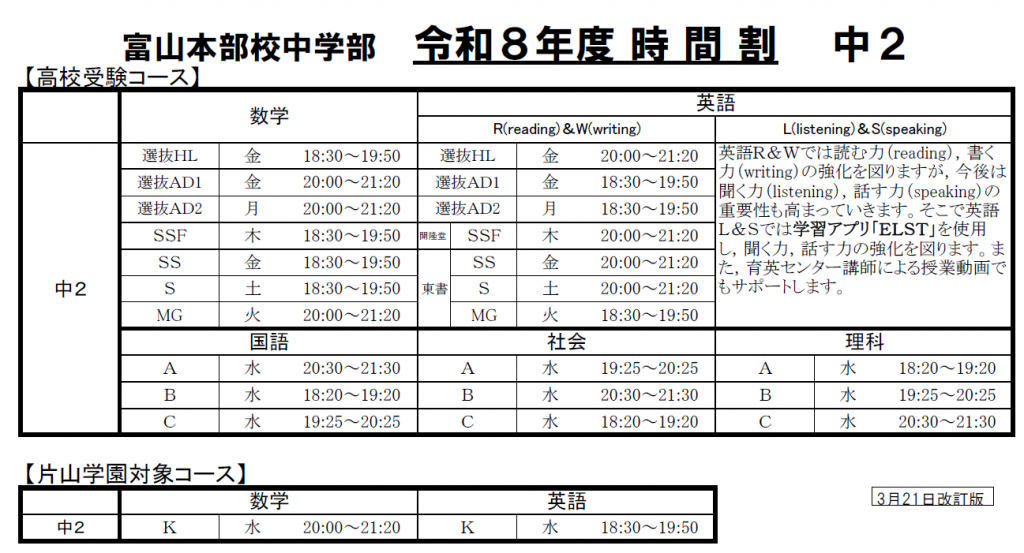 印刷用はこちら⇒2026時間割1学期富山本部校中学部_中2