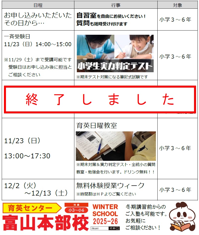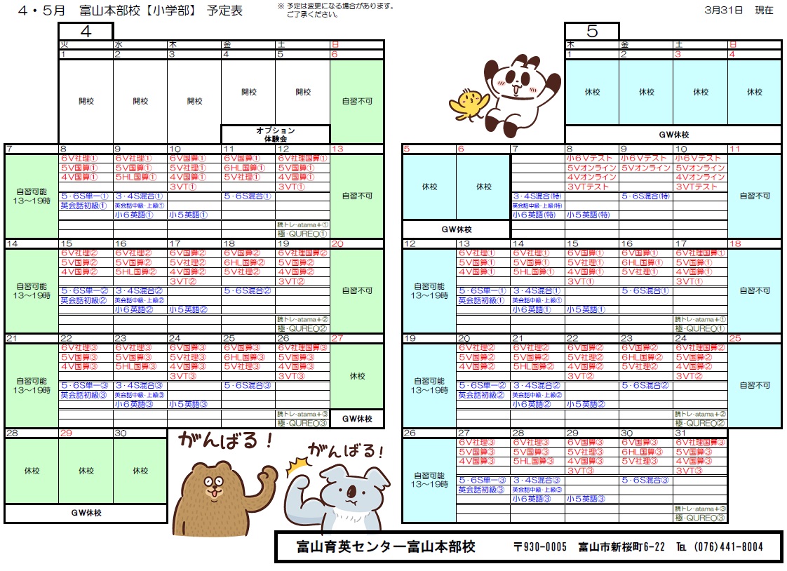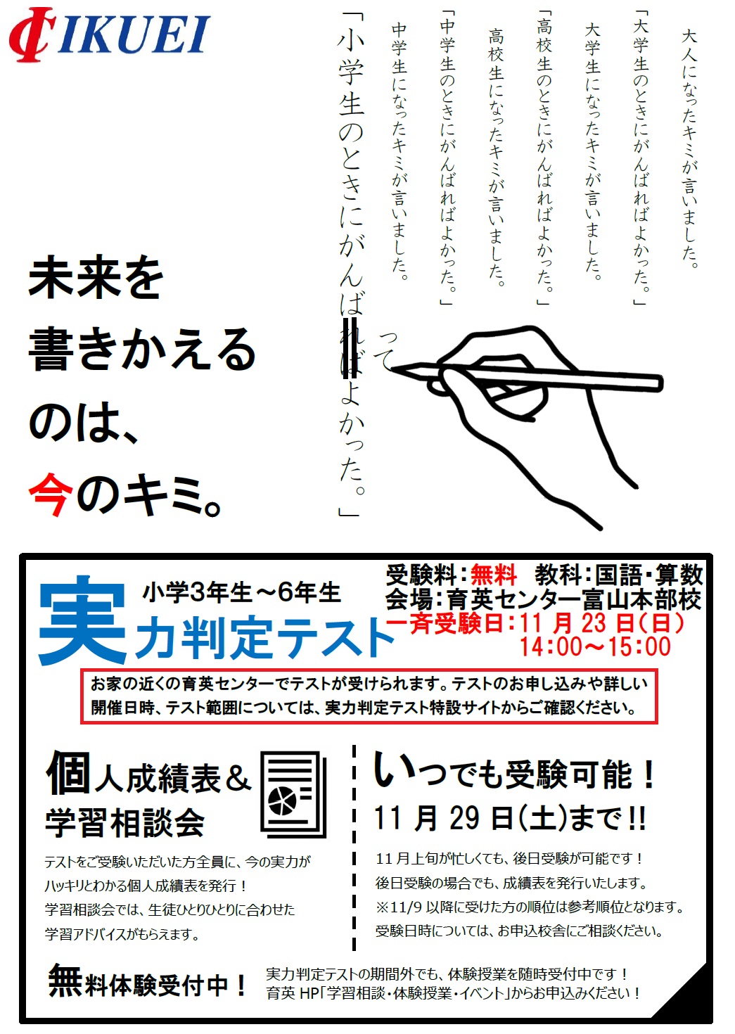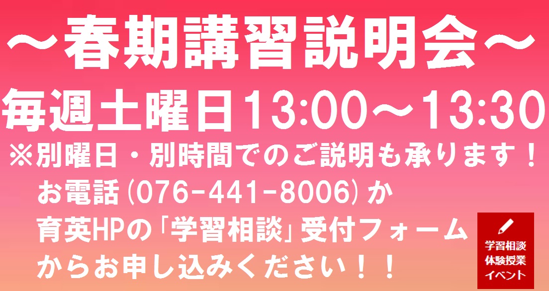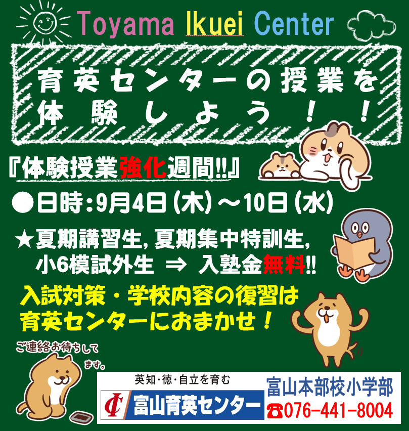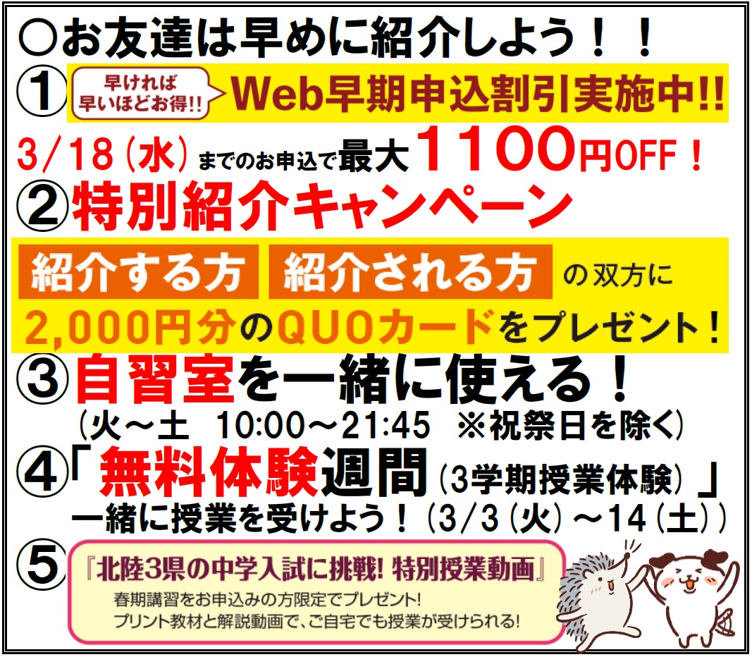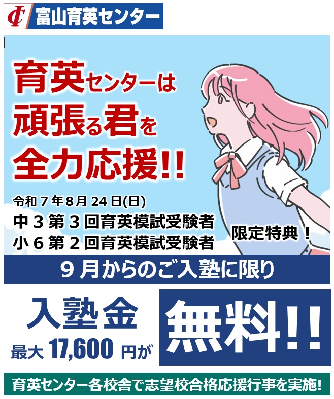 教師や保護者が「勉強しなさい」と言っても,なかなか子供たちの心には響かないものです。一番,子供たちの勉強へのエンジンがかかるのは,「周りの友達が努力しはじめた」時です。中学受験は富山県ではまだまだ少数派であり,小学校全体が受験ムードになる事はありません。子供たちを,受験生が多い環境下においてあげることで,自覚が生まれていくのです。その意味では,富山本部校が最良の環境であると自負しています♪