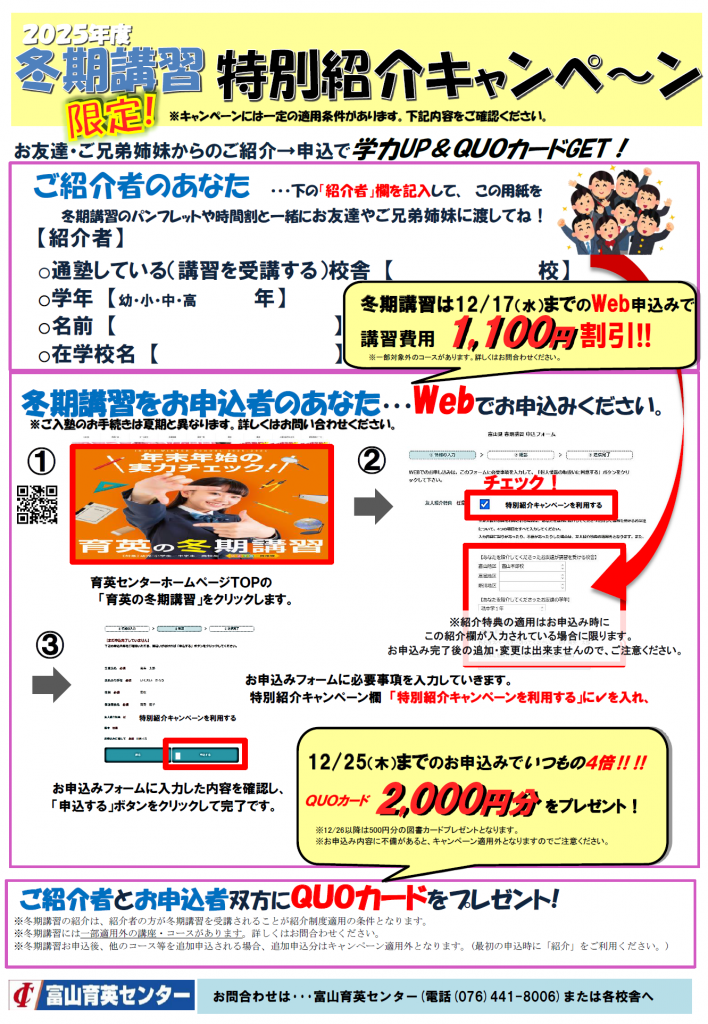 育英センターのホームページからWebにて12月17日(水)までにお申し込みの方は講習料金から1,100円割引となります。